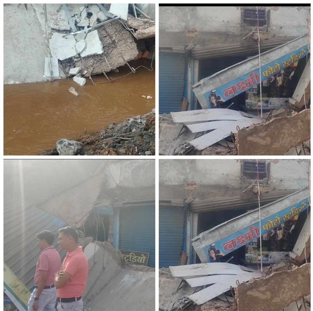 अल्का कंपलेक्स में बनी 4 दुकानें की छज्जा भरभरा का नीचे गिरी बाल बाल बच्चे लोग