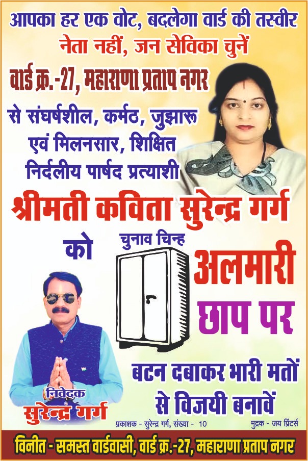 वार्ड नंबर 27 महाराणा प्रताप नगर से संघर्षशील कर्मठ जुझाव एवं मिलनसार शिक्षित निर्दलीय पार्षद प्रत्याशी श्रीमती कविता सुरेंद्र गर्ग को चुनाव चिन्ह अलमारी छाप पर प्रचंड मतों से विजय बनावे आपका हर एक वोट बदलेगा वाट की तस्वीर नेट नहीं जनसेविका चुने आप लोगों ने भाजपा को दिया मौका कांग्रेस को दिया मौका लेकिन वार्ड में कोई भी विकास का कार्य नहीं हुआ एक बार निर्दलीय श्रीमती कविता सुरेंद्र गर्ग को अलमारी छाप पर बटन दबाकर भारी मतों से विजय बनावे