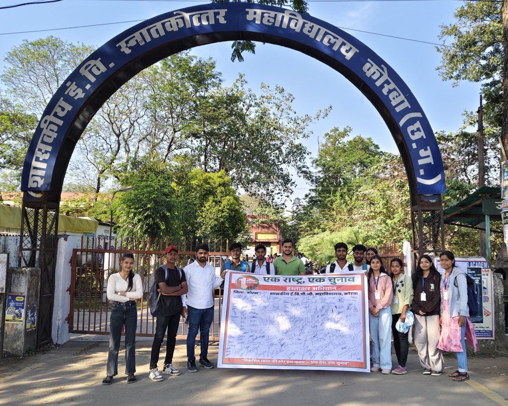 Samachar Chhattisgarh Korba.प्रधानमंत्री नरेंद्र मोदी की महत्वाकांक्षी पहल एक राष्ट्र-एक चुनाव के तहत पूरे देश में चल रहे व्यापक अभियान का शुभारंभ कोरबा ज़िला के शासकीय ई.वि.पी.जी. महाविद्यालय में हस्ताक्षर अभियान के रूप में किया गया। कोरबा जिले के ‘एक राष्ट्र, एक चुनाव’ अभियान छत्तीसगढ़ प्रदेश प्रभारी शिवरतन शर्मा विधायक भाँटपारा के निर्देशानुसार भाजपा ज़िला अध्यक्ष गोपाल मोदी के मार्गदर्शन से सह संयोजक मोंटी पटेल के नेतृत्व में आयोजित इस कार्यक्रम में बड़ी संख्या में छात्र-छात्राओं ने उत्साहपूर्वक भाग लिया।