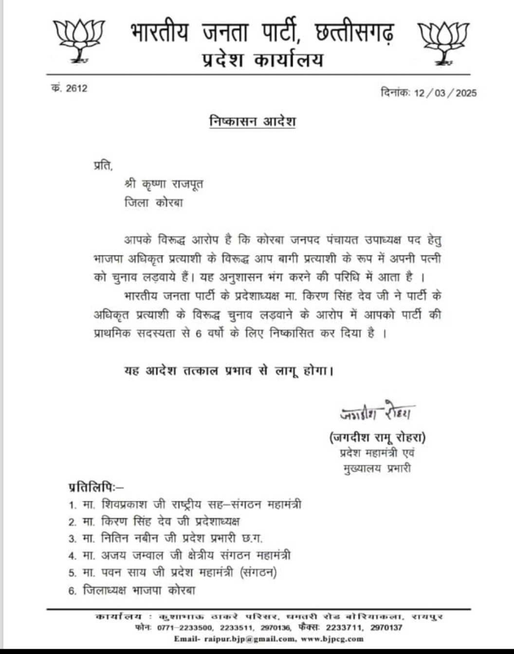प्रदेश भाजपा कार्यालय से जारी आदेश संख्या 2609, 2610, 2611 और 2612 के तहत, अरविंद भगत, कृष्णा राजपूत, चंद्रकांता राजपूत और मोनिका भगत को तत्काल प्रभाव से पार्टी से बाहर कर दिया गया। इन सभी नेताओं ने कोरबा जनपद पंचायत चुनाव में पार्टी लाइन के विरुद्ध जाकर बगावत की थी।