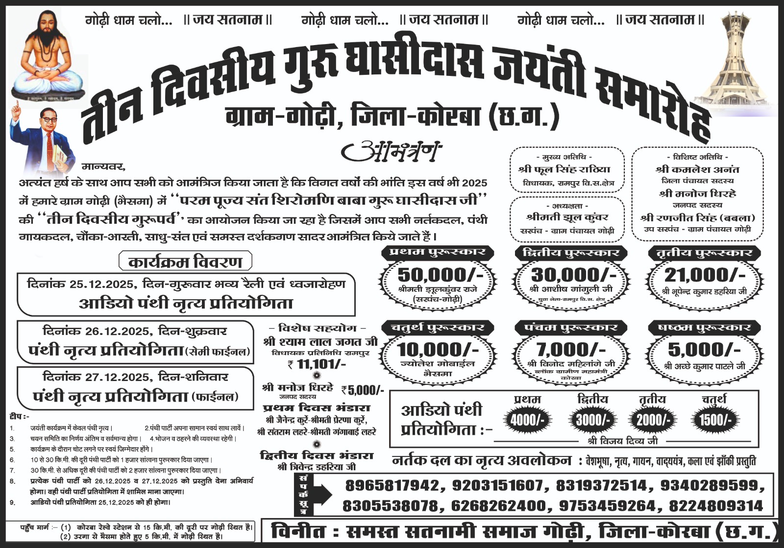 गोडी धाम में तीन दिवसीय गुरु घासीदास जयंती का भव्य आयोजन ग्राम गोडी, जिला कोरबा में सांस्कृतिक कार्यक्रमों की धूम 25 से 27 दिसंबर तक
