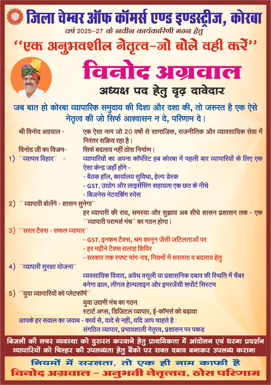 जिला चैंबर ऑफ कॉमर्स एंड इंडस्ट्रीज कोरबा के चुनाव में अध्यक्ष पद हेतु श्री विनोद अग्रवाल की दावेदारी के बाद ही सभी व्यापारियों के बीच अपनी बात रखकर कहां है कि व्यापारियों की सुरक्षा, समृद्धि, सुविधा दिलाने और टैक्स से जुड़ी जटिलता को समाधान करने का प्रयास करेंगे।