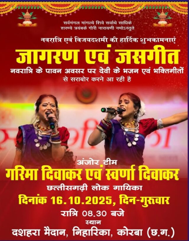 इस विशेष भक्ति कार्यक्रम में छत्तीसगढ़ की प्रसिद्ध लोक गायिकाएँ गरिमा दिवाकर और स्वर्णा दिवाकर अपनी मनमोहक प्रस्तुतियों से श्रद्धालुओं को देवी भक्ति में सरोबार करेंगी।