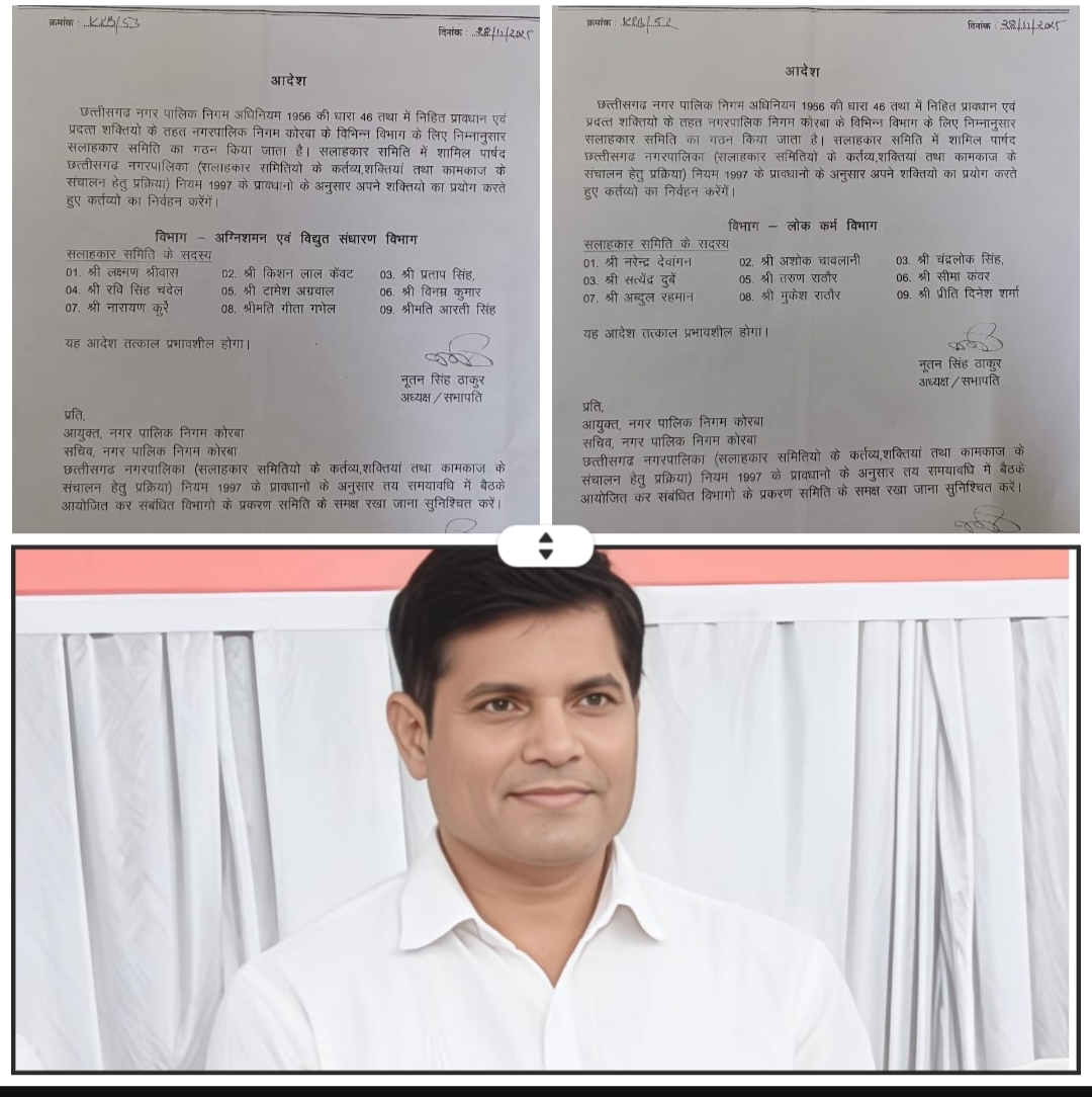 Samachar Chhattisgarh Korba.नगर निगम कोरबा क्षेत्र में नागरिक सुविधाओं के विकास, प्रशासनिक पारदर्शिता और जनहित से जुड़ी योजनाओं के प्रभावी क्रियान्वयन हेतु सलाहकार समितियों का गठन किया गया है।