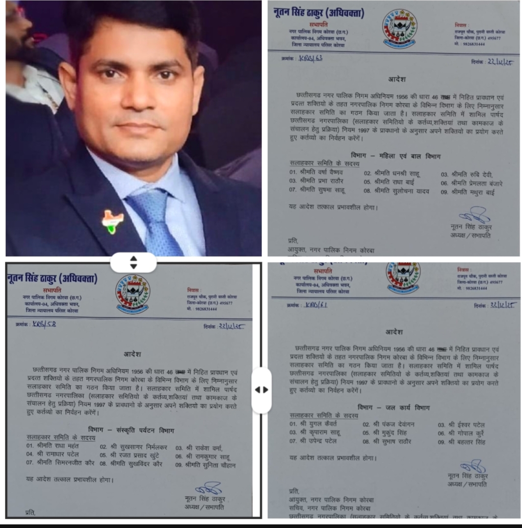 Samachar Chhattisgarh Korba.नगर पालिका निगम कोरबा के सभापति व अध्यक्ष नूतन सिंह ठाकुर ने छत्तीसगढ़ नगर निगम अधिनियम के तहत विभिन्न सलाहकार समितियां का गठन किया है। निगम सभापति नूतन सिंह ठाकुर ने इससे पहले भी दो समितियां का गठन किया था, इस बार चार विभागों के लिए गठित समितियां में 36 पार्षदों को स्थान दिया गया है जिसमें भाजपा, कांग्रेस और निर्दलीय पार्षद शामिल हैं। निगम अध्यक्ष नूतनसिंह ठाकुर द्वारा अधिनियम की धारा 46 के तहत आदेश जारी कर उद्यानिकी विभाग के सलाहकार समिति में तरुण राठौर, विनम्र तिवारी, बद्री किरण, अनुज जायसवाल, चेतन सिंह मैत्री, चंदाबाई, सीमा कंवर , चंद्रकाली जायसवाल, श्रीमती सम्मत कुंवर कों शामिल किया गया है। इसी प्रकार जल कार्य विभाग समिति में युगल कैवर्त , पंकज देवांगन, ईश्वर पटेल, कृपाराम साहू, मुकुंद सिंह कंवर, गोपाल कुर्रे, उपेंद्र पटेल, सुभाष राठौड़ और बहत्तर सिंह शामिल किए गए हैं। महिला एवं बाल विभाग समिति में निगम के महिला पार्षदों को शामिल कर समिति बनाया गया है जिसमें वर्षा वैष्णव, धनश्री साहू, रूबी देवी, प्रभा राठौर, राधाबाई, प्रेमलता बंजारे, सुषमा साहू, सुलोचना यादव, मथुरा बाई को शामिल है। संस्कृति एवं पर्यटन विभाग समिति में राधा महंत, सुखसागर निर्मलकर, राकेश वर्मा, रामाधार पटेल, रजत खुटे, रामकुमार साहू, सिमरनजीत कौर, सुखविंदर कौर, सुनीता चौहान को शामिल करते हुए समिति गठित की गई है।