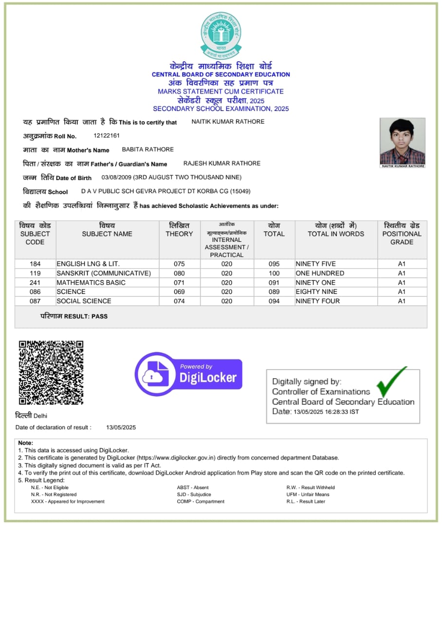 Samachar Chhattisgarh कोरबा जिले के नैतिक कुमार राठौर ने 10 वीं बोर्ड परीक्षा में मारी बाजी जिन्होंने 93.8/से अक हासिल कर स्कूल टॉपर बना केंद्रीय माध्यमिक शिक्षा बोर्ड (CBSE) 10वी परीक्षा परिणाम घोषित कर दिए गए हैं इस परीक्षा में कोरबा जिले के गेवरा D. A.V. PUBLiC SCH GEVRA हाई सेकेंडरी स्कूल इंग्लिश मीडियम के छात्र नैतिक कुमार राठौर ने 93.8/ अक हासिल कर स्कूल में टॉप किया नैतिक कुमार राठौर के इस शानदार प्रदर्शन ने न केवल उनके स्कूल बल्कि पूरे जिले में खुशी की लहर दौड़ पड़ा नैतिक ने अपनी सफलता का श्रेय अपने माता और गुरु जनों को दिया है उन्होंने कहा कि मेरी मां और शिक्षकों का अटूट विश्वास और समर्थन मेरे लिए सबसे बड़ा शहर रहा उनकी प्रेरणा और मार्गदर्शन ने मुझे इस मुकाम तक पहुंचने में मदद की नैतिक राठौर इस उपलब्धि ने साबित कर दिया है की कड़ी मेहनत और समापन से कुछ भी हासिल किया जा सकता है हमें उम्मीद है कि भविष्य में इसी तरह की सफलता हासिल करेगा और अपने माता और शिक्षकों का नाम रोशन करेगा