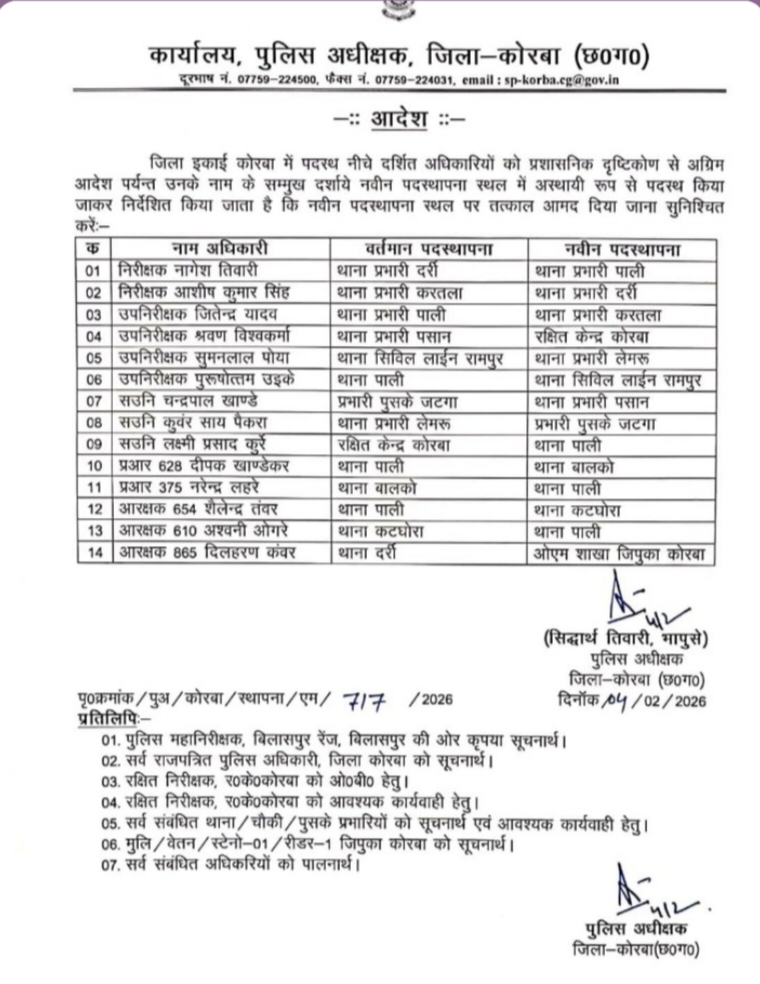 Samchar Chhattisgarh.कोरबा। जिला पुलिस अधीक्षक सिद्धार्थ तिवारी द्वारा प्रशासनिक दृष्टिकोण से जिले में पदस्थ कई पुलिस अधिकारियों के तबादले के आदेश जारी किए गए हैं। जारी आदेश के अनुसार विभिन्न थाना प्रभारियों एवं उप निरीक्षकों को उनके वर्तमान पदस्थापना स्थल से हटाकर नई जिम्मेदारी सौंपी गई है।