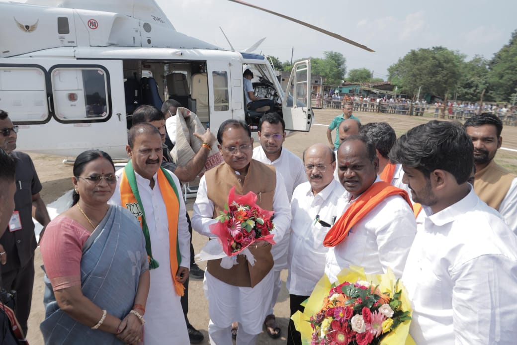 मुख्यमंत्री  विष्णु देव साय का कटघोरा मेला ग्राउंड हेलीपेड पर जनप्रतिनिधियों ने किया आत्मीय स्वागत