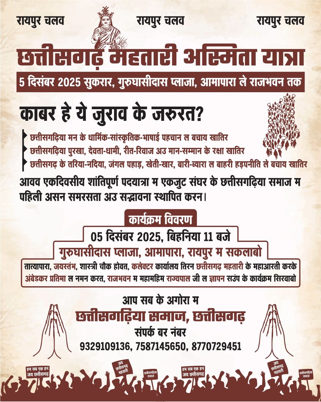 Samachar Chhattisgarh Korba छत्तीसगढिया सर्व समाज द्वारा छत्तीसगढ़ महतारी के सम्मान, छत्तीसगढ़ की अस्मिता, पुरखों के गौरव, तथा प्रदेश के जल–जंगल–जमीन की सुरक्षा को लेकर आज राजधानी रायपुर में महतारी अस्मिता रैली का आयोजन किया जा रहा है। यह रैली दोपहर 12 बजे आमापारा स्थित गुरु घासीदास प्लाजा से प्रारंभ होकर कलेक्टोरेट रायपुर तक निकलेग